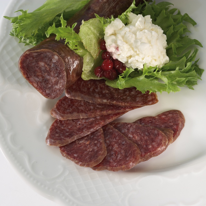 Kjerizo Stabburstørka pølse av geit, svin, salt og chorizo-krydderblanding. God på tur, koldtbordet, til pizza eller kokt torsk.