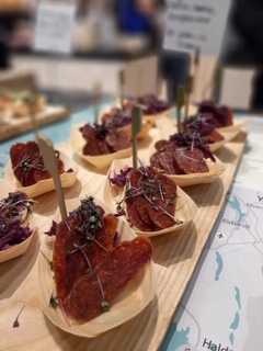 Spekepinne med øl Stabburstørka pølse av geit, svin, salt, pepar og glutenfritt øl frå 7 Fjell Bryggeri, Fløyen IPA.